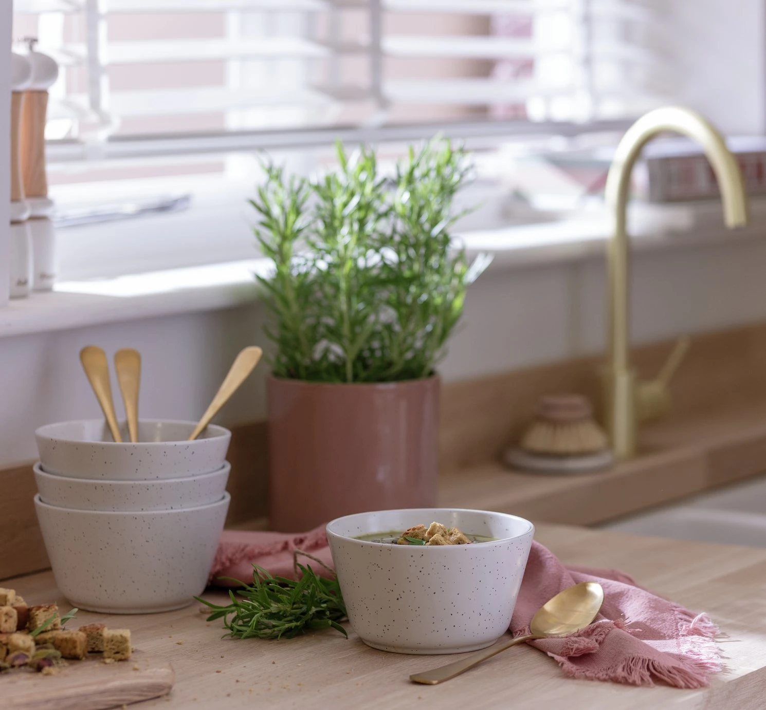 Spruce up that spread. Our set of 4 white cereal bowls bring a big helping of organic style to the table. Simple and contemporary, this speckled stoneware set is great for showing off colourful curries, seasonal soups and morning muesli. A matte glaze gives each one a clean, modern finish. Go on, grab a spoon.