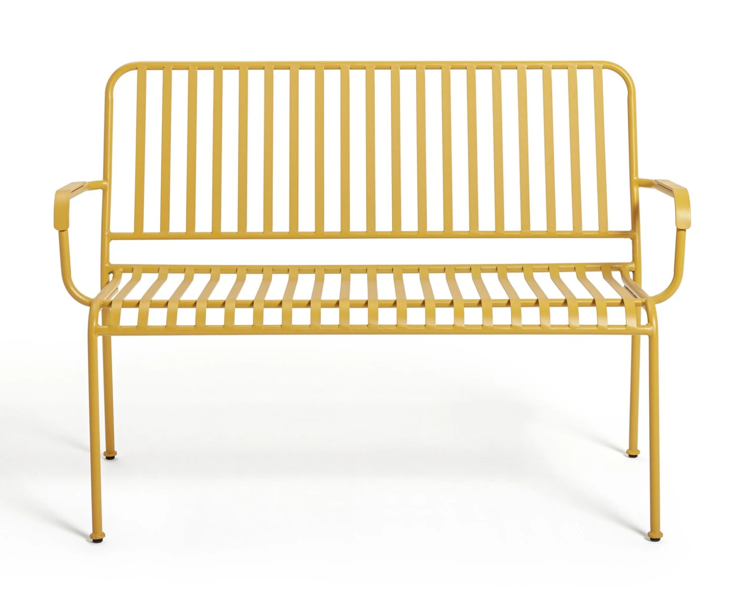 Not so mellow yellow. Don't be misled by this bench's pretty face. Our Indu bench has a strong steel frame built to withstand all the garden action you can throw at it. The perfect feature for your outdoor space, it seats three comfortably. Festoon with outdoor cushions and create a stylish and relaxed place to read a book, enjoy a drink in the sun or just sit and watch the clouds roll by.