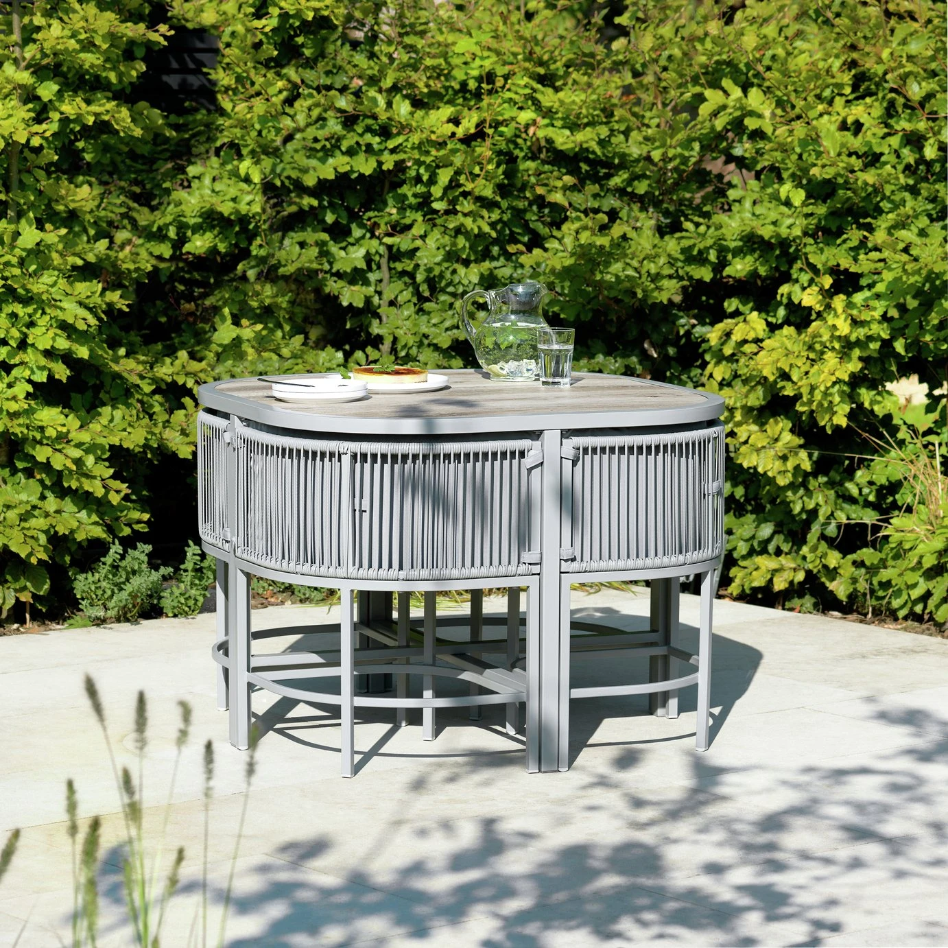 Alfresco eating a bit of a squeeze? Here's a natty solution. One oak-effect table. Four handwoven rattan and steel chairs. Cleverly designed to comfortably host up to four guests. When the guests have gone, simply slide the chairs under the table. And pop the cushions inside. We think it's a great way to make the most of limited outdoor space. Stylishly curved chairs feature easy clean rattan. And all eight soft grey cushions have washable covers too. Who gets the first invite?