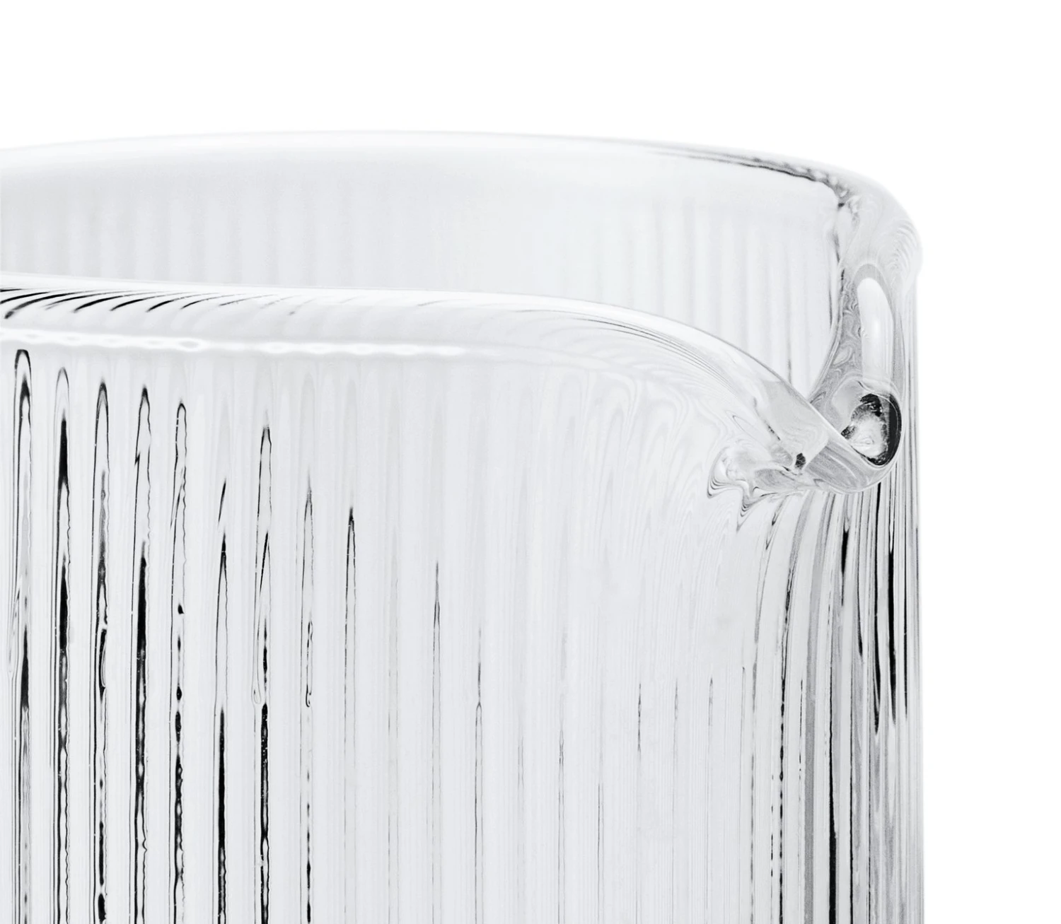 A distinctive hand-blown glass carafe, now that's how to serve water in style. The simple linear design is emphasized by the ribbed texture. Idea for the dining table, or guest room, this is one cool carafe.
